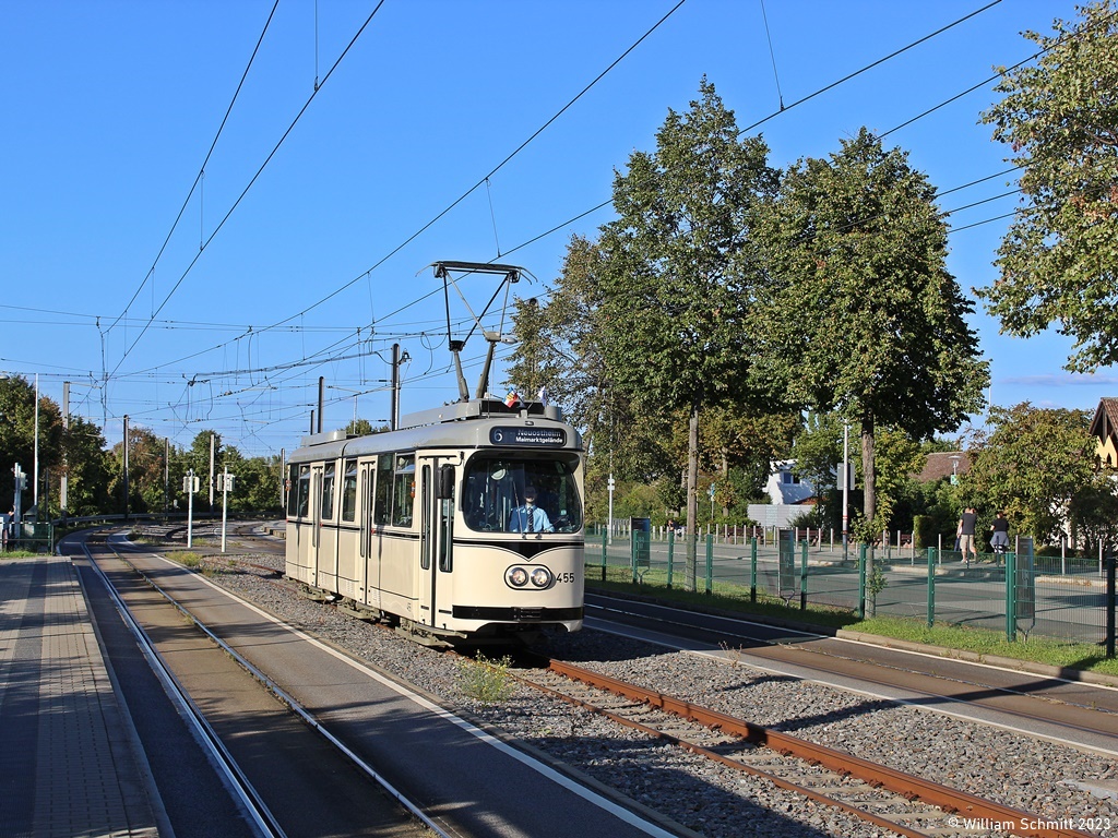 455 als Grüne Bahn auf Sonderfahrt auf der Sandhofer Straße | 455 als Grüne Bahn auf Sonderfahrt auf der Röntgenstraße |