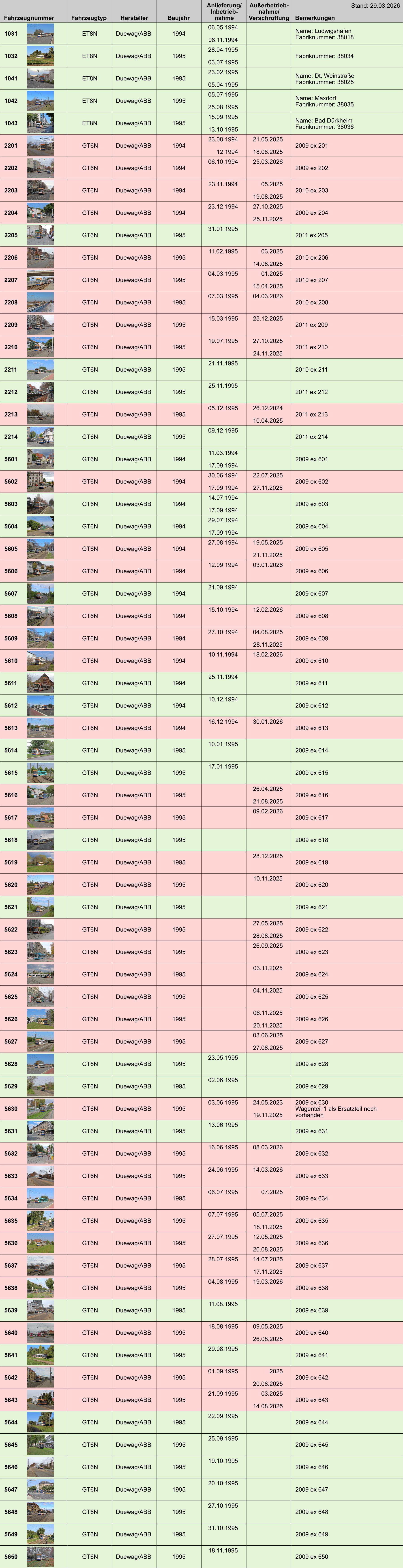 In der untensehenden Tabelle sind alle Fahrzeuge des Typs GT6N bzw. ET8N zu finden. Die Farbe hinter der Fahrzeugnummer bildet den Status des Fahrzeuges ab.