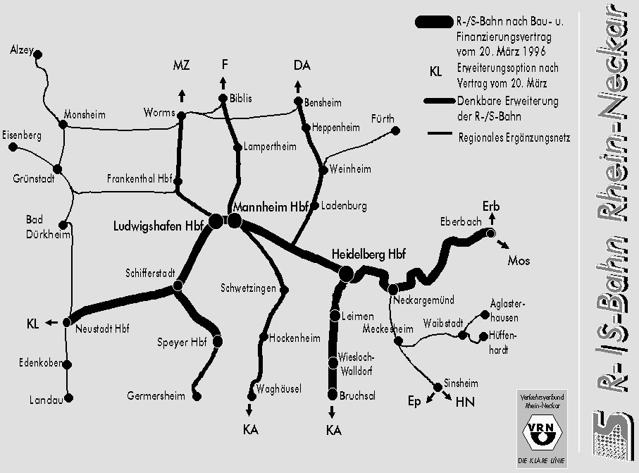 Am 20. März 1996 wurde der Bau- und Finanzierungsvertrag für die R-/S-Bahn Rhein-Neckar durch die DB AG, die Länder Baden-Württemberg, Hessen und Rheinland-Pfalz sowie dem ZRN unterzeichnet. Damit war die S-Bahn beschlossene Sache. Am 15. November 1997 fand der erste Spatenstich für die notwendige zweite Brücke über den Rhein zwischen Mannheim und Ludwigshafen statt, welcher auch Startschuss für den Bau der S-Bahn Rhein-Neckar war.